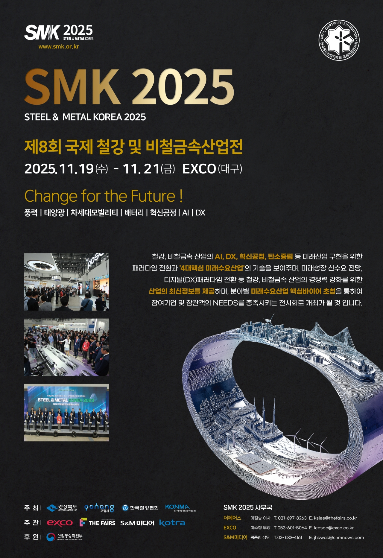 이번 SMK 2025는 우리나라 철강 및 비철산업의 중심지이자 주최 기관인 경상북도(대구 엑스코)에서 개최될 예정이다. 특히 경상북도와 포항시, 한국철강협회, 한국비철금속협회 등이 주최를 맡고, 본지와 엑스코, 더페이스, 코트라(KOTRA)가 주관을 담당하기로 하였으며, 산업통상자원부 등 정부 기관이 후원하는 등 성공적 행사 개최를 위해 관련된 대형 기관들이 참여의 뜻을 밝혔다.