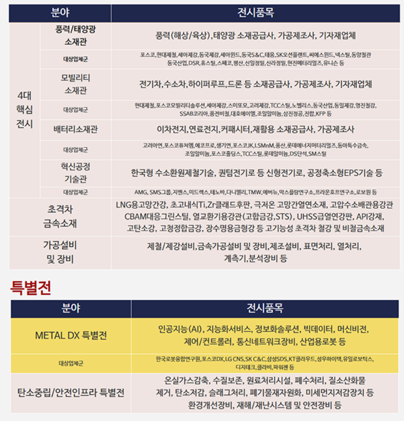 부스 구분은 여기서 그치지 않고 ‘초격자 금속소재’를 주제로 LNG용 고망간강, 초내식 Ti, Zr 클래드후판, 극저온 고망간열연소재, API강재, 열교환기용강, CBAM 대응 그린스틸, 고청정합금강 등의 철강·비철금속 소재를 다루는 공간이 마련될 계획이다. 또한 철강·금속 시장의 한 축인 ‘가공설비 및 기술장비’를 주제로 제철·제강설비, 금속가공설비 및 장비, 제조설비, 표면처리, 열처리, 분석·검사장비 등의 제품과 서비스, 기술 등을 홍보하는 장소를 구축할 예정이다.