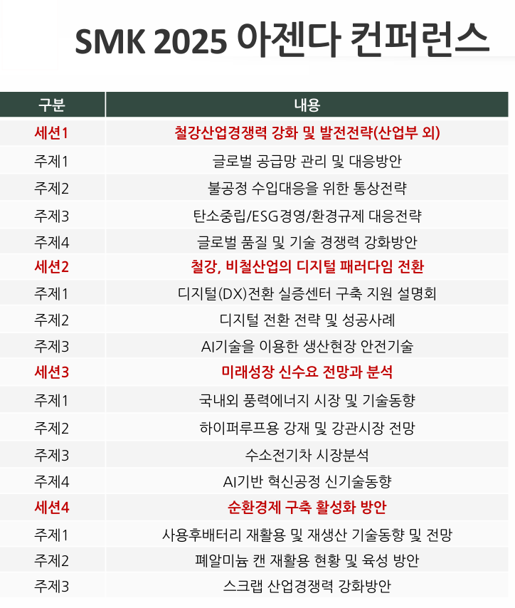 아울러 SMK2025 주관 측은 올해 처음 선보이는 프로그램인 ‘SMK 어워즈’에 성공적 도입을 위해 힘쓰고 있다. SMK 어워즈는 철강·금속업계를 대상으로 각 부문 평가를 통해 우수기업 선정과 추진기관별 시상을 진행할 예정이다.