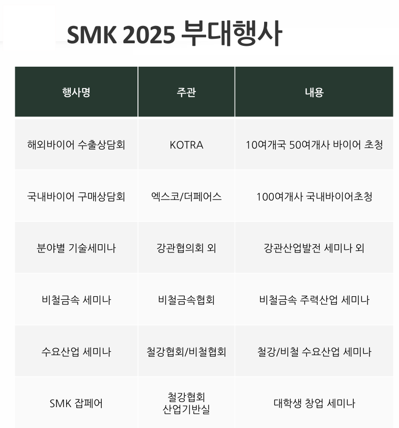 SMK2025는 ‘Change for the Future!(미래를 향한 변화)’를 슬로건으로 철강과 금속산업의 지속가능성을 위한 국내외 바이어 구매상담회와 기술·신수요·공급망·DX·AX·4차산업혁명 등 업계인들이 관심을 갖고 있는 다수 분야의 전문가 세미나 개최, 철강 및 수요단체의 세미나, 인재발굴을 위한 잡페어 및 대학생 창업세미나 등 다수의 프로그램을 준비하고 있다.