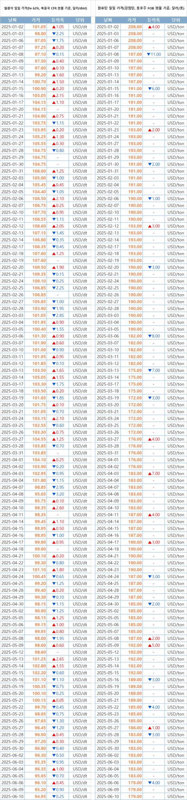 [표] 일일 철강 원료 가격 동향(6월 10일)
