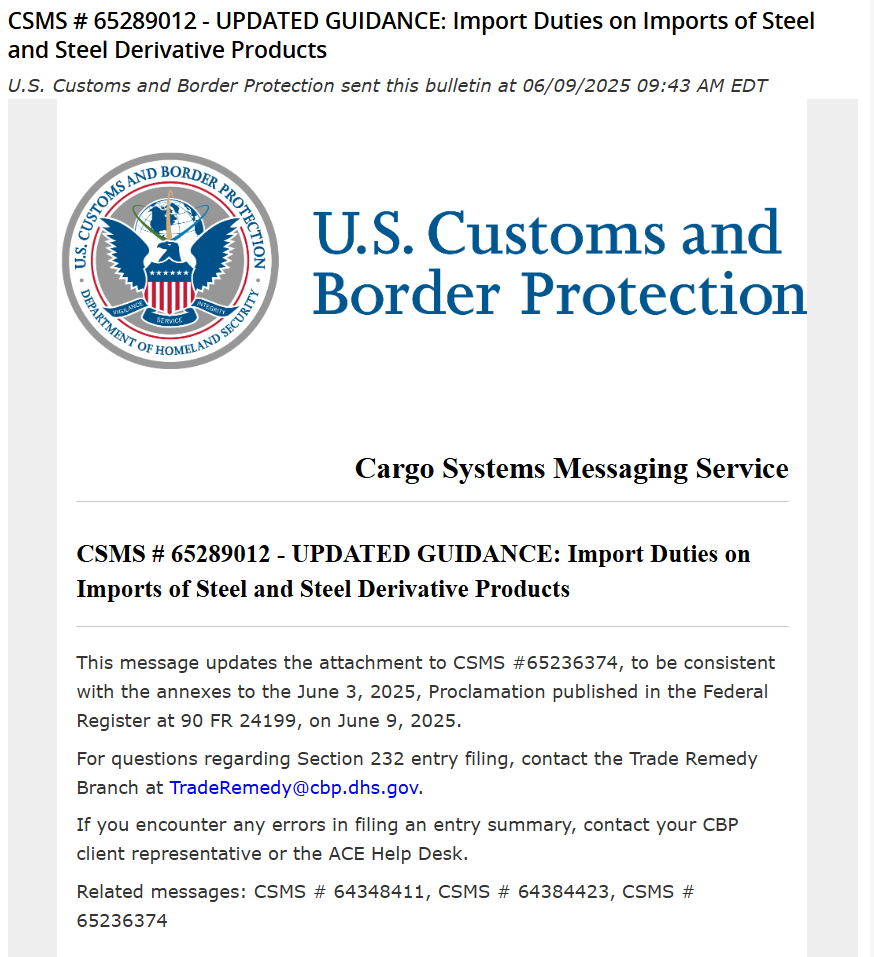제232조에 따른 철강, 알루미늄 및 그 파생제품의 관세 부과 대상 품목은 미국 CBP 홈페이지의 화물 시스템 메시지 서비스(CSMS) 공지를 통해 확인할 수 있다.