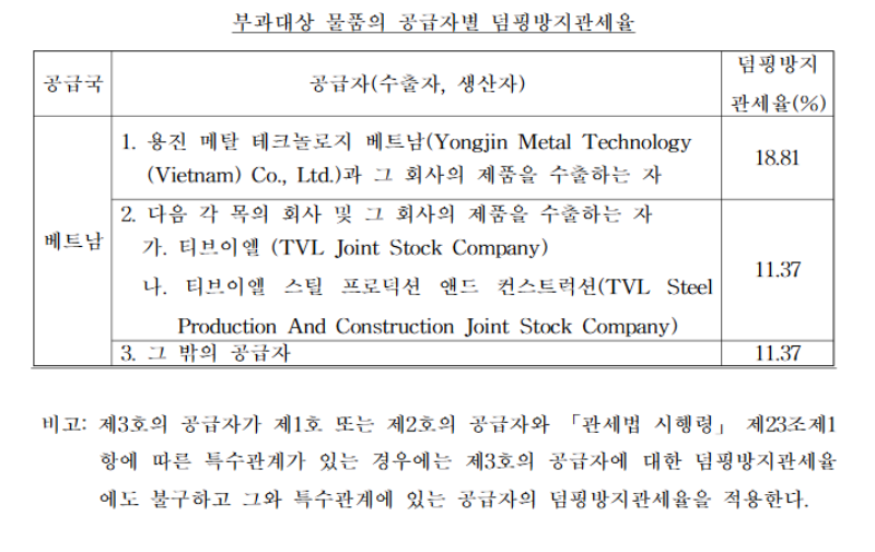 업체별 최종 덤핑방지관세는 ‘용진 메탈 테크놀로지 베트남(용진금속/Yongjin Metal Technology Co., Ltd.)’이 18.81%로 가장 높게 책정됐고, ‘티브이엘(TVL Joint Stock Company)’과 ‘티브이엘 스틸(TVL Steel Production And Construction Joint Stock Company) 등 티비으엘 그룹사들은 11.37%가 부과됐다. 또한 그밖에 베트남 STS CR 공급자에는 11.37% 수준이다.