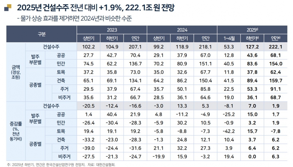 건산연에 따르면 올해 건설수주는 222조1,000억원으로 전년 대비 1.9% 증가할 전망이다.