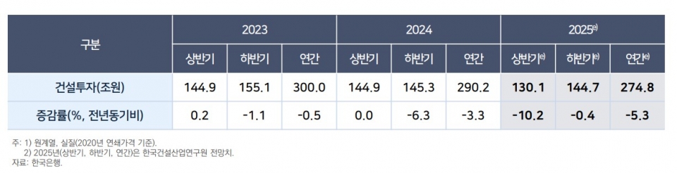 이에 따라 올해 건설투자는 274조8,000억원으로 전년 대비 5.3% 감소할 것으로 예상됐다.
