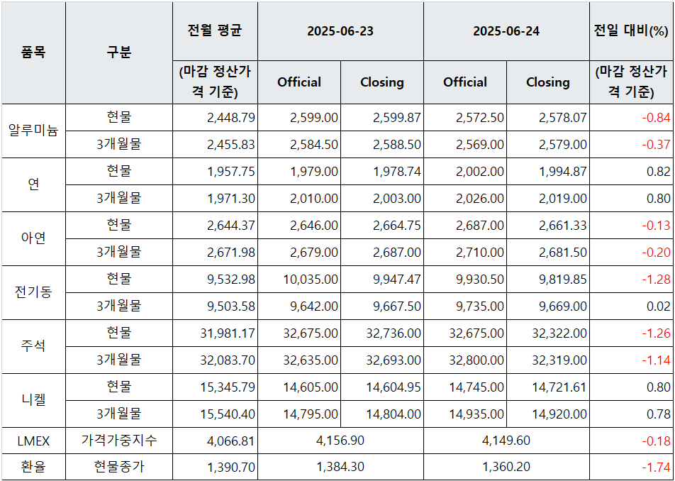 [표] LME 비철금속 및 환율 동향(6월 24일)