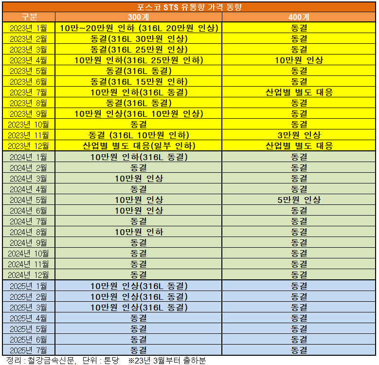 포스코는 올해 1분기에 매월 300계 유통향 출하 가격을 톤당 10만 원(실수요향은 1·3월에 각각 톤당 10만 원) 씩 인상하다가 2분기에는 3개월 모두 동결을 결정한 바 있다. 이번 7월 가격 동결 결정으로 300계는 4개월 연속, 400계는 지난해 6월부터 14개월 연속 같은 출하 가격을 유지하게 됐다.