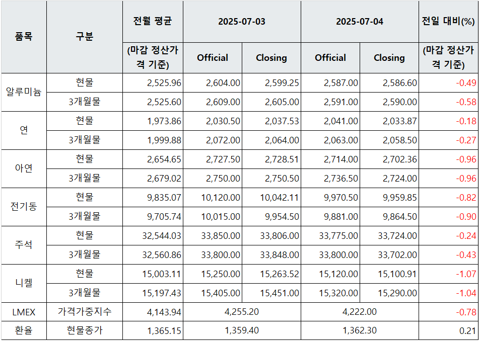 [표] LME 비철금속 및 환율 동향(7월 4일)