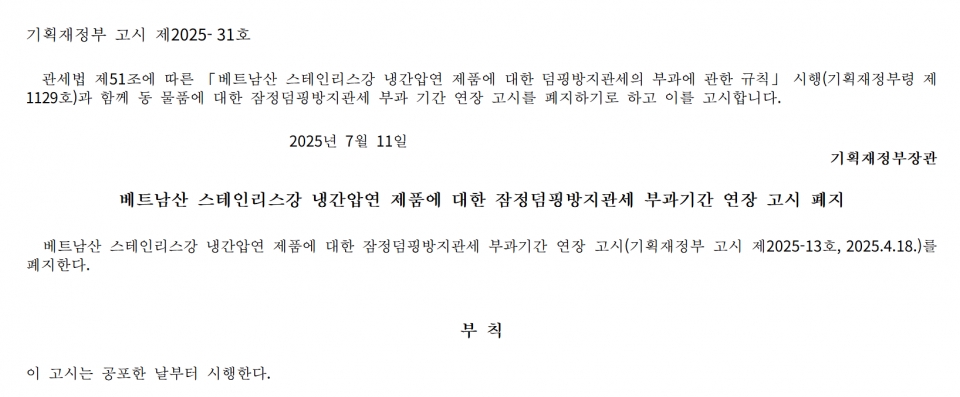 지난 11일, 기재부는 ‘베트남산 STS CR 제품에 대한 덤핑방지관세의 부과에 관한 규칙’이 시행됐다며 지난 4월 적용한 잠정 반덤핑 관세 연장 고시를 폐지한다고 고시했다.