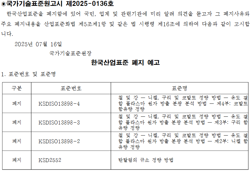 KS D ISO13898-2 등 연관 3건은 대체 표준인 KS D 1673-1~4(철 및 강 – 유도결합 방출 분광 분석법 제1부~4부)로, KS D 2552는 대체 표준인 KS D 2552(탄탈림의 ICP 방출 방광 분석 방법)로 대체되며 폐지가 결정됐다.