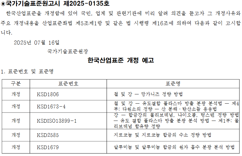16일, 국표원은 ‘철 및 강 - 망가니즈 정량방법(KS D 1806)’과 ‘철 및 강 – 유도결합 플라스마 방출 분광 분석법 – 제4부 :다원소의 정량 –산 분해·탄산소듐 용융법(KS D1673-4)’, ‘강 – 합금강의 몰리브데넘, 나이오븀, 텅스텐 정량 방법 – 유도 결합 플라스마 방출 방광 분석 방법 – 제1부: 몰리브데넘 함유량 정량(KS D ISO 13899-1)’, ‘지르코늄 및 지르코늄 합금의 수소 정량 방법(KS D 2585)’, ‘알루미늄 및 알루미늄 합금의 원자 흡수 분광 분석 방법(KS D 1679)’ 등 5건의 개정을 예고했다.