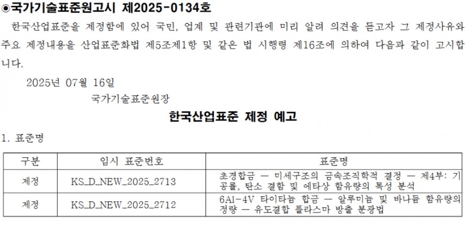 한편, 국표원은 국제표준 부합화를 위해 철강·금속 관련 표준 2건을 제정할 것이라고 예고했다. 2건의 임시 표준 번호 및 제목은 ‘초경함금 – 미세구조의 금속조직학적 결정 – 제4부: 기공률, 탄소 결합 및 에타상 함유량의 특성 분석(KS D NEW 2025 2713)’과 ‘6AI-4V 타이타늄 합금 – 알루미늄 및 바나듐 함유량의 정량 – 유도결합 플라스마 방출 분광법(KS D NEW 2025 2712)’ 등이다. 해당 제정 예고 건의 의견도 9월 14일까지 접수한다.