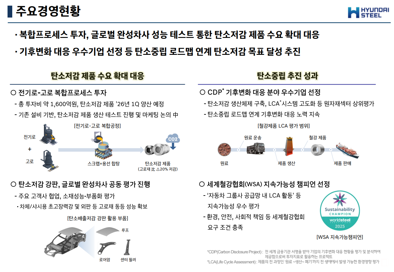 현대제철은 복합프로세스 투자를 진행하고 있다며 글로벌 완성차사의 성능 테스트 통한 탄소저감 제품 수요가 확대되는 점에 대응하고 있다고 밝혔다. 특히 전기로로 생산한 차체/샤시용 초고장력강 및 외판 등에서 고로재와 동등성능을 확보했다고 주장했다.