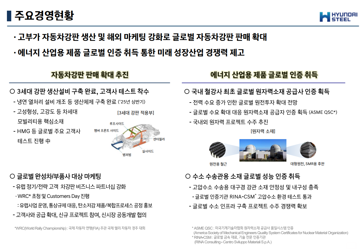 또한 현대제철은 에너지산업용 제품의 글로벌 인증 취득을 통해 미래 성장산업 경쟁력을 높이고 있다. 회사는 국내 철강사 최초로 글로벌 원자력 소재 공급사 인증을 획득했고, 수소 수송관용 소재의 글로벌 성능인증도 취득했다. 용전용 철근과 SMR용 후판, 고압 수소 수송용 대구경강관 소재 등의 글로벌 판매 경쟁력이 향상될 것으로 예상된다.