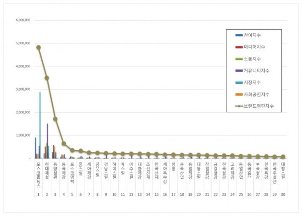 이어 동국제강이 65만7,833점으로 4위, 포스코엠텍이 36만1,862점으로 5위를 기록했다. 동국제강은 미디어 및 커뮤니티 노출 확대가 긍정적으로 작용했고, 포스코엠텍은 브랜드소통과 시장지수 항목에서 꾸준한 상승세를 이어갔다.