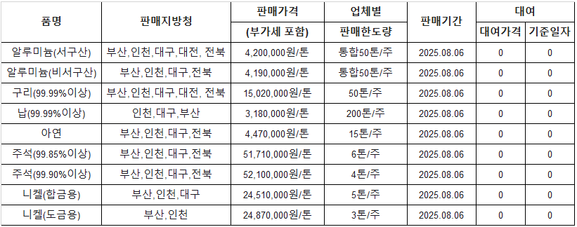 [표] 조달청 방출 가격(8월 6일)