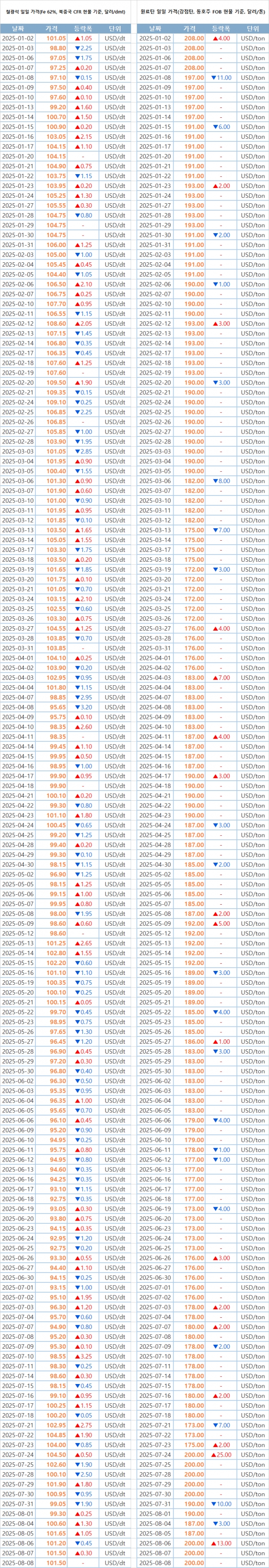 [표] 일일 철강 원료 가격 동향(8월 8일)