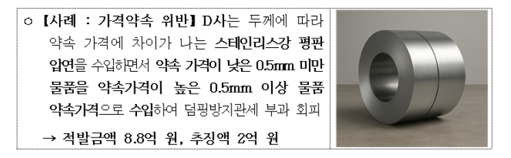 덤핑제재 대상기업과의 수출가격 인상약속에 따라 스테인리스강 평판압연재 중 두께 0.5㎜ 이상 스테인리스 강판에는 고부가치재인 두께 0.5㎜ 박판보다 상대적으로 낮은 약속가격이 적용되는 가운데, 관세청은 국내 한 수입사가 실제론 두께 0.5㎜ 이하 수입재를 계약해놓고는 두께 0.5㎜ 이상 제품으로 속여 통관 신고한 점을 적발했다.