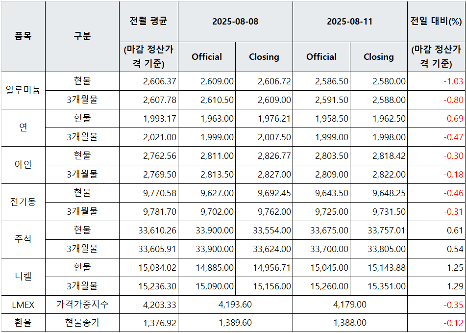 [표] LME 비철금속 및 환율 동향(8월 11일)