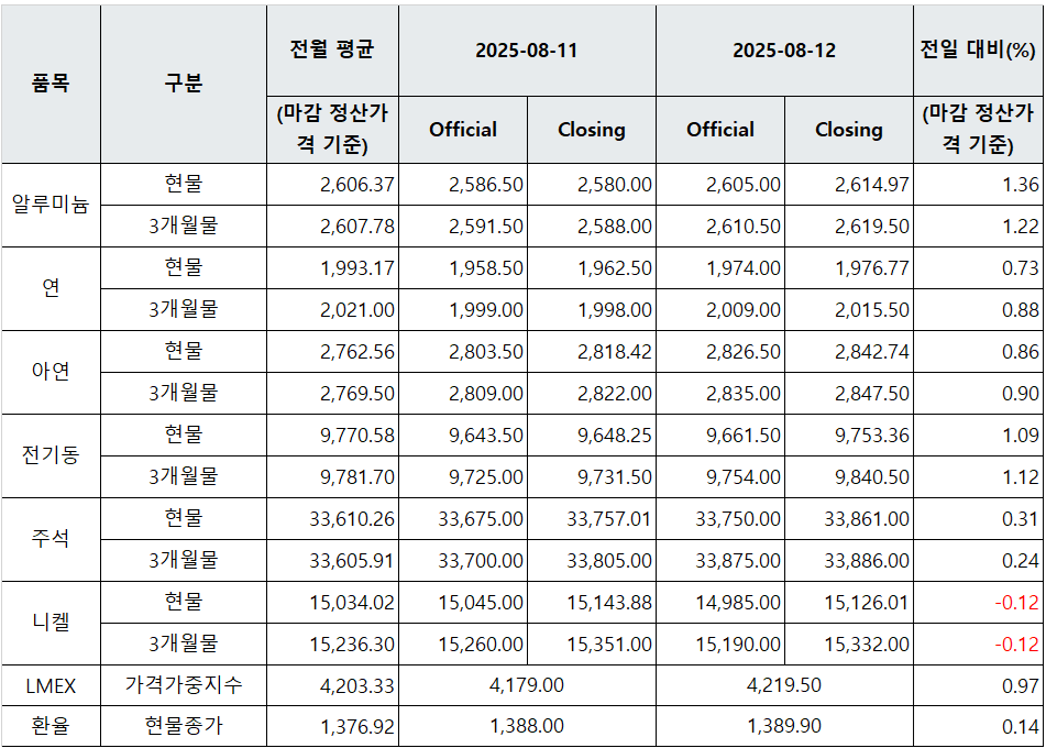 [표] LME 비철금속 및 환율 동향(8월 12일)