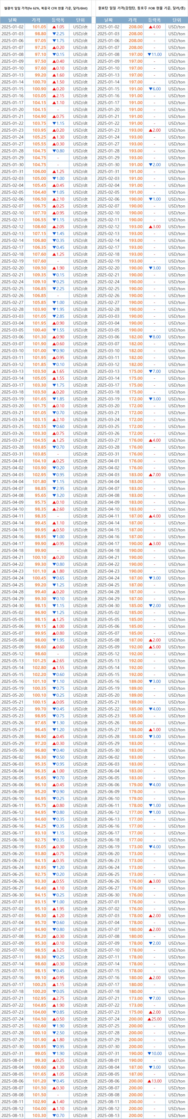 키워드 #철광석 #원료탄 이사무엘 기자 smlee@snmnews.com 다른 기사 보기 관련기사 아이치제강, FY2026 1Q 매출액·영업이익 증가 이제는 아시아 시장까지…日, 중국·한국산 GI 반덤핑 조사 합금철 위기 ‘심각’…생산·판매 30만 톤도 위태 [이슈] 덤핑률만 본 건 반쪽…일본·중국 열연 반덤핑 조사 속 숨은 전쟁 (주간시장동향 – 선재) 수요 감소에도 규제 미비·공급망 붕괴에 수입 증가 [주간시장동향-후판] 비수기에도 가격 유지 [주간시장동향-열연강판] 하절기 관망 속 반덤핑·수입선 변화, 4분기 가격 정상화 시험대 포스코 광양제철소, 직원 자녀 대상 GIST AI과학캠프 개최 美 LNG선도 K-조선이 건조…MASGA로 美 조선업 ‘재건’·韓 신시장 ‘활짝’ 대한조선, 2분기 연속 영업이익률 20%대…수익성 유지 속 생산성 강화 세아제강지주, 2분기 매출액 1조209억원 기록…전년대비 1.1% 증가 7월 글로벌 조선 수주 반토막…한국 점유율 16%, LNG·컨선 선별 수주 집중 저작권자 © 철강금속신문 무단전재 및 재배포 금지