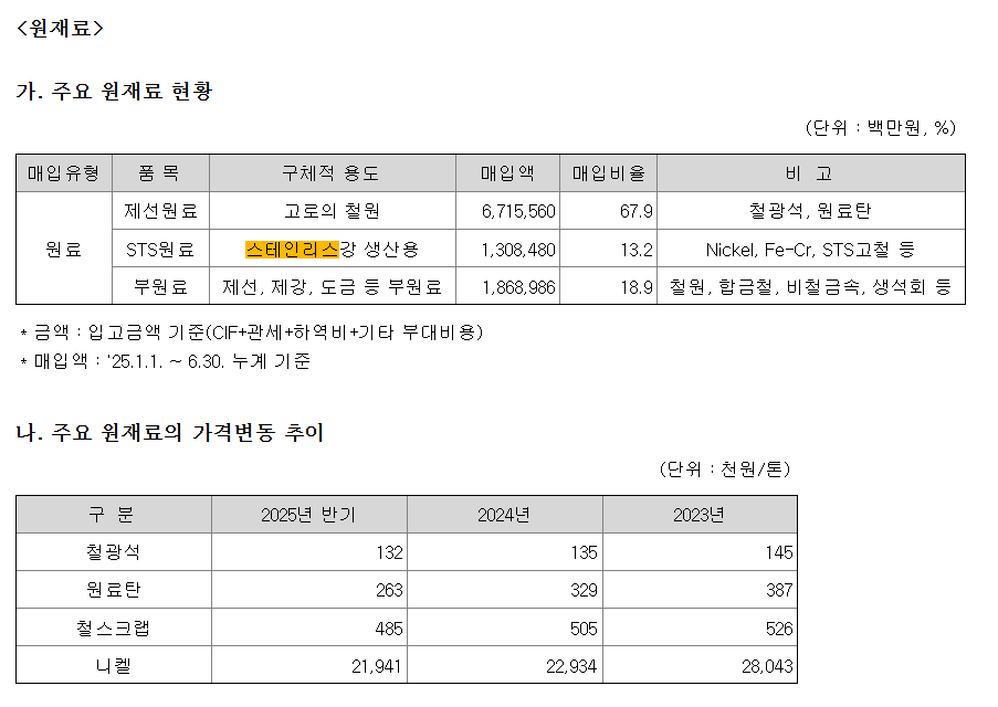 포스코가 상반기 STS원료(니켈, 페로크로뮴, STS스크랩 등) 구매에 투입한 비용은 1조 3,084억 8천 만원으로 전년 동기 1조 7,239억 3,800만원보다 24.3% 급감했다. 전반전 원료 가격 약보합세 속에 원료 재고 운영도 빡빡한 했던 결과로 풀이된다.