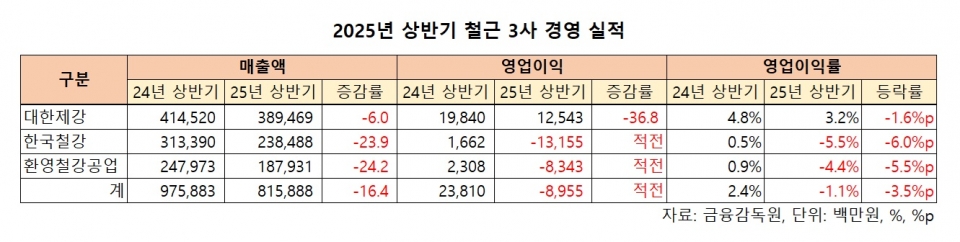 반면 한국철강과 환영철강은 올 상반기 20% 수준의 매출 감소와 함께 각각 132억원, 83억원의 대규모 영업손실을 기록했다.