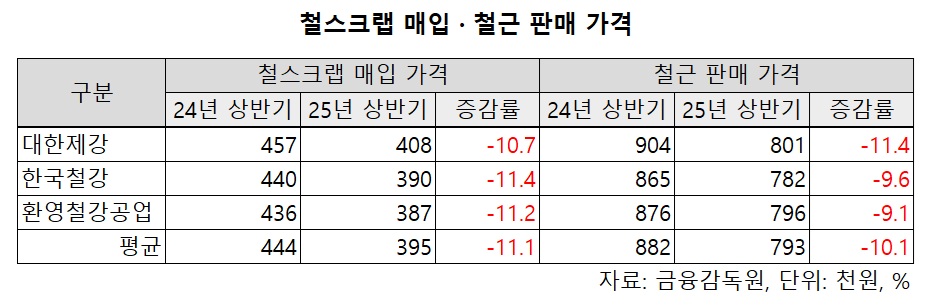 올 상반기 이들 제강사 철근 평균 판매 가격은 톤당 79만3,000원으로 전년 동기 대비 10.1% 하락했으며, 철스크랩 매입 단가 역시 11.1% 내린 39만5,000원으로 집계됐다.