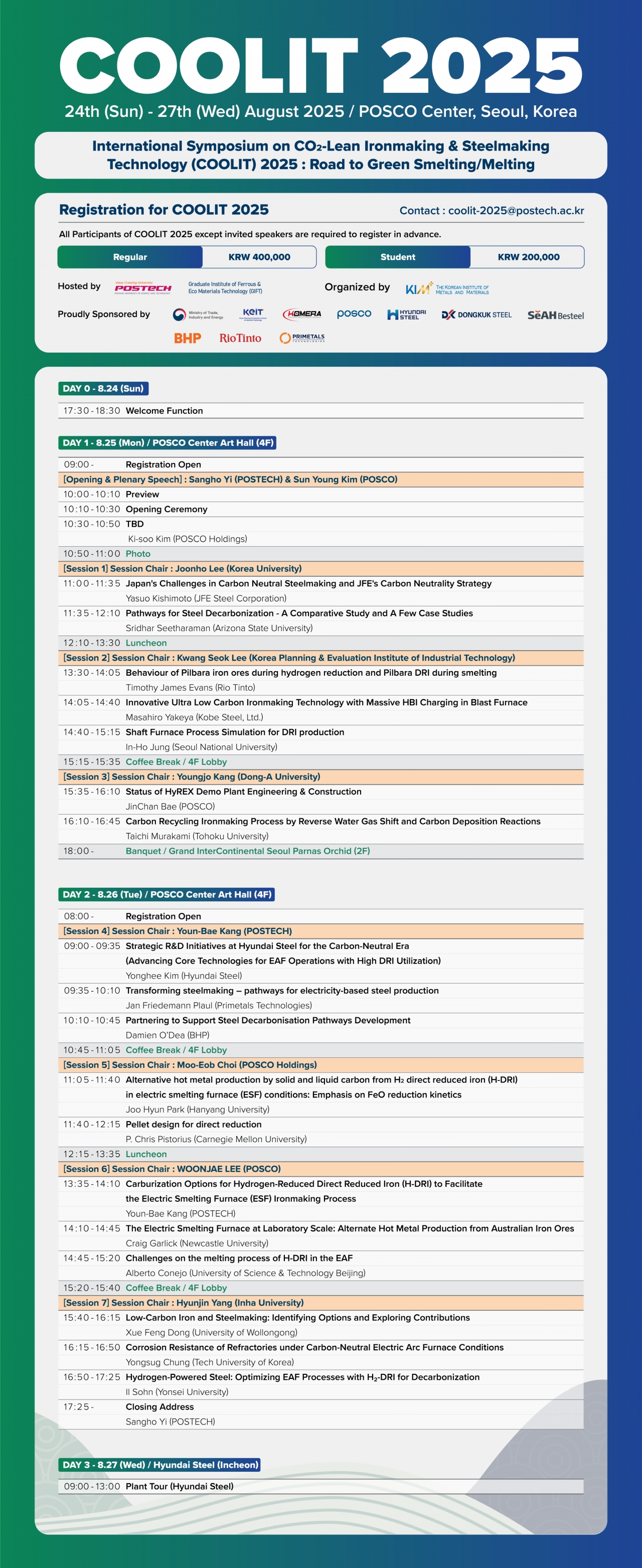 오는 8월 24일에서 27일까지 나흘간 서울 포스코센터에서 철강산업 탄소중립 달성을 위한 최신 기술과 글로벌 동향을 공유하는 ‘COOLIT 2025 국제 심포지엄(International Symposium on CO2-Lean Ironmaking & Steelmaking Technology(COOLIT) 2025 : Road to Green Smelting/Melting)’이 개되쵠다.