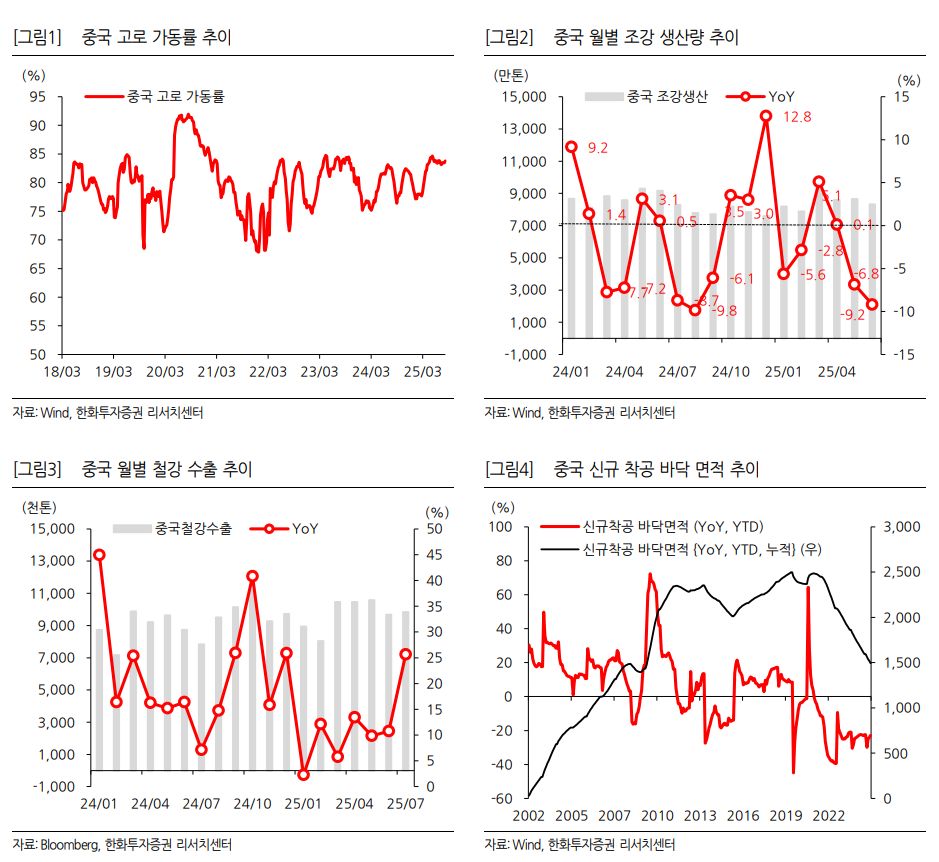또한 이번 중국의 감산 움직임은 지난 7월, 중앙정치국 회의의 ‘무질서한 경쟁 관리’ 정책 기조가 실질적인 공급 조절로 이어지고 있음을 보여주는 신호로 해석되고 있다. 권 연구원은 “2025년 5월과 6월 이미 전년 동기 대비 각각 6.8%, 9.2% 감소한 조강 생산량의 하락세를 더욱 심화시킬 전망”이라며 “8월 들어 감산 분위기가 명확해졌으며, 하순 이후에는 지역별·기업별 세부 감산 정책이 추가로 발표되며 감산 강도가 심화될 것으로 보인다”고 전했다.