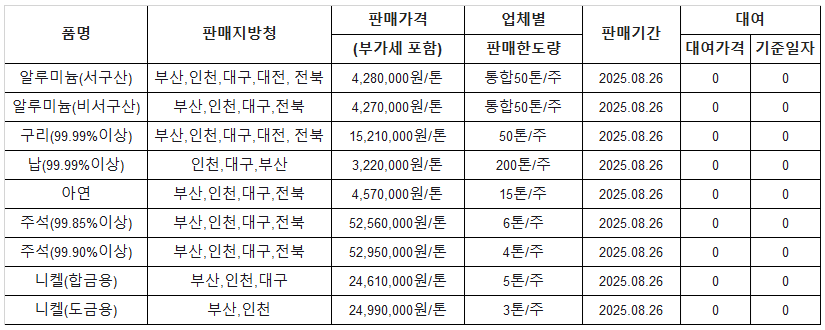 [표] 조달청 방출 가격(8월 26일)