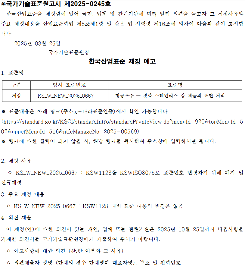 국표원은 “KS W 1128 표준은 경화성 스테인리스강의 표면처리를 다루는 국제 표준인 ‘ISO8075:1985’에 부합하다”며 “이에 내용은 변경하지 않지만 표준 번호를 변경하기 위해 기존 표준을 폐지하고 새로운 표준인 ‘KS W NEW 2025 0667(임시 번호/향후 KS W ISO 8075로 변경)’를 제정하려 한다”고 설명했다.