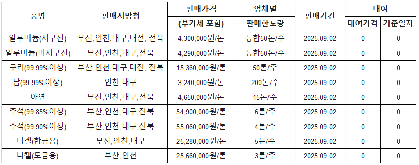 [표] 조달청 방출 가격(9월 2일)
