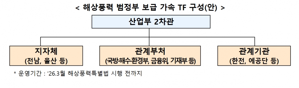 10일, 산업통상자원부는 서울 여의도 전력기반센터에서 범정부 해상풍력 보급 가속 TF 킥오프 회의를 개최했다. 내년 3월 시행될 해상풍력특별법에 앞서 해상풍력 프로젝트별 인·허가 및 제약사항 해소, 인프라 지원, 금융 강화 등을 추진하여 해상풍력 보급을 가속화하기 위한 조처다.