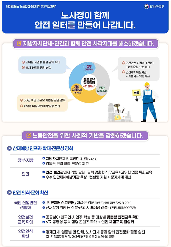 특히 2028년까지 점검·감독 사업장을 61만 개소로 확대할 방침이다. 고용노동부가 감독 대상 사업장을 7만 개소(2028년)로 대폭 확대하고 지방자치단체도 30인 미만 사업장에 대해 2028년까지 3만 개소 점검·감독을 목표로 지역별 위험 요인에 맞는 예방 사업을 운영할 예정이다.
