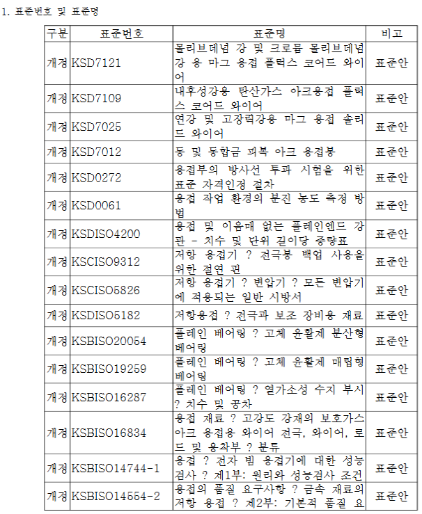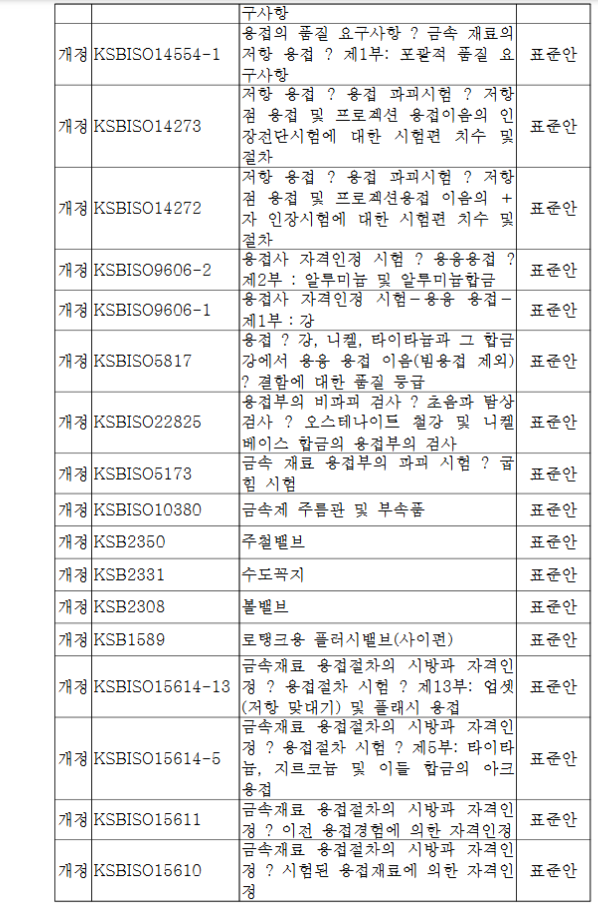 국표원은 ‘금속제 주름관 및 부속품(KS BISO 10380)’과 ‘주철밸브(KS B 2350)’, ‘수도꼭지(KS B 2331)’, ‘볼밸브(KS B 2308)’, ‘로탱크용 플러시밸브(사이편/KS B 1589)’, ‘몰리브데넘강 및 크로뮴 몰리브데넘강 용 마그 용접 플럭스 코어드 와이어(KS D 7121)’, ‘내후성강용 탄산가스 아크용접 플럭스 코어드 와이어(KS D 7109)’, ‘연강 및 고장력강용 마그 용접 솔리드 와이어(KS D 7025)’, ‘동 및 동합금 피복 아크 용접봉(KS D 7012)’ 등 33개 표준의 개정을 예고했다.