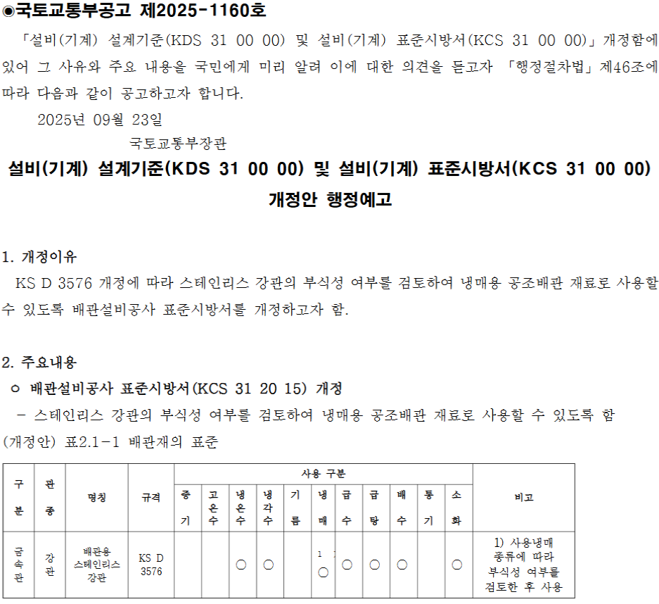 23일, 국토교통부는 KS D 3576 ‘배관용 스테인리스 강관’이 한국산업표준(KS) 개정을 완료함에 따라 부식성 여부를 검토한다는 조건으로 ‘배관설비공사 표준시방서 KSC 31 20 15’가 정의하는 조건을 개정한다고 밝혔다. 이에 따라 해당 표준시방서를 사용하는 현장에서 배관용 스테인리스 강관이 냉매용 공조배관으로도 사용 가능한 길이 열리게 됐다.