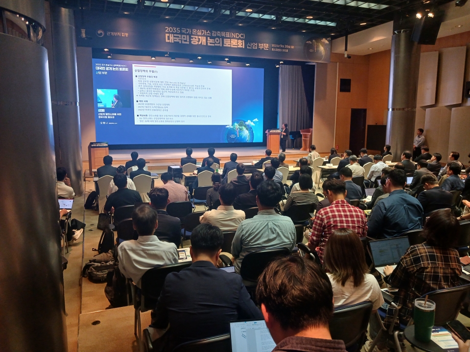 26일 서울시 강남구 포스코센터 아트홀에서 정부 주최로 ‘2035 국가 온실가스 감축목표(NDC) 대국민 공개 논의 토론회’가 열렸다. 산업계를 대상으로 한 이번 토론회는 김성환 환경부 장관 등 정부 고위 관계자, 산업계 대표, 시민사회 대표 등 100여 명이 참석했다.