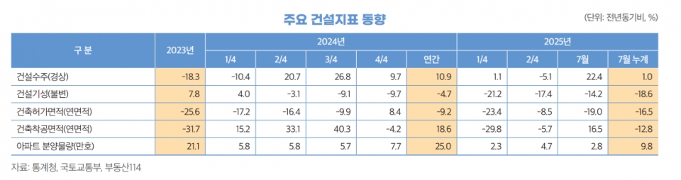 올 1~7월 금액 기준 선행지표인 건설수주(경상)는 전년 대비 기저효과로 1.0% 늘었으나, 같은 기간 물량 기준 선행지표인 건축허가는 16.5% 급감했다.