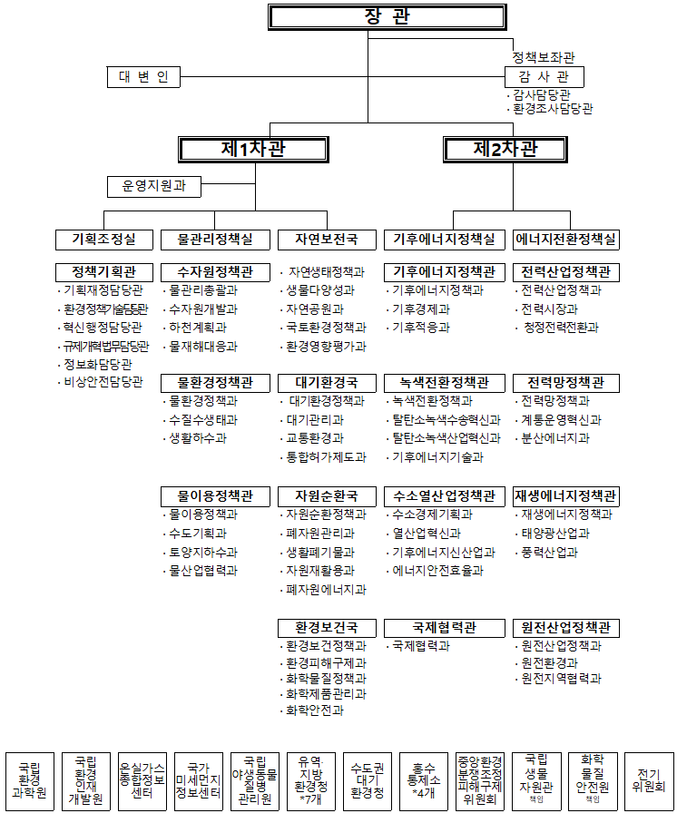 1차관 소속으로 기획조정실, 물관리정책실과 자연보전국, 대기환경국, 자원순환국, 환경보건국을 편제하여 △미세먼지 저감, △순환경제 구축, △화학물질 안전 등 새 정부 국정과제에 포함된 핵심 환경정책의 차질 없는 추진과 국민 체감형 환경 서비스를 확대해 나간다.