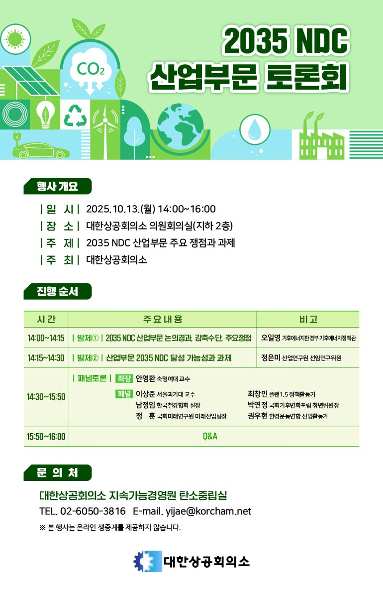 13일, 대한상의는 서울 대한상의 의원회의실에서 ‘2035 NDC 산업부문 토론회’를 개최했다. 이 행사는 정부의 2035 NDC(안)에 대해 산업계를 비롯한 다양한 이해관계자 의견을 수렴하기 위해 마련됐다.