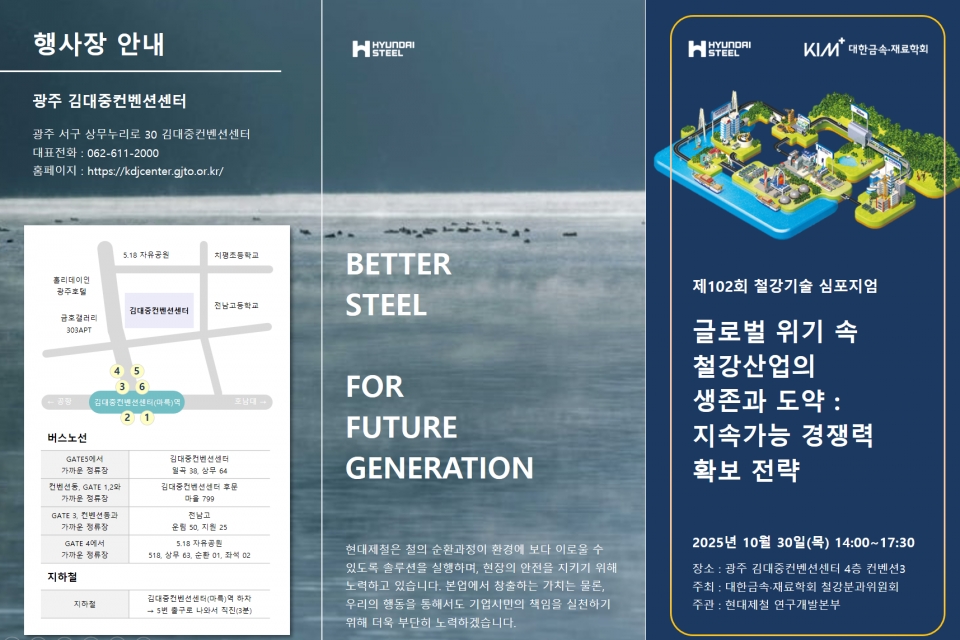 대한금속·재료학회는 10월 30일, 광주 김대중컨벤션센터 4층 컨벤션3에서 제102회 철강기술심포지엄을 연다고 밝혔다. ‘글로벌 위기 속 철강산업의 생존과 도약: 지속가능 경쟁력 확보 전략’을 주제로 열리는 본 심포지엄은 대한금속·재료학회 철강분과위원회가 주최하고 현대제철 연구개발본부가 행사 주관을 맡았다.