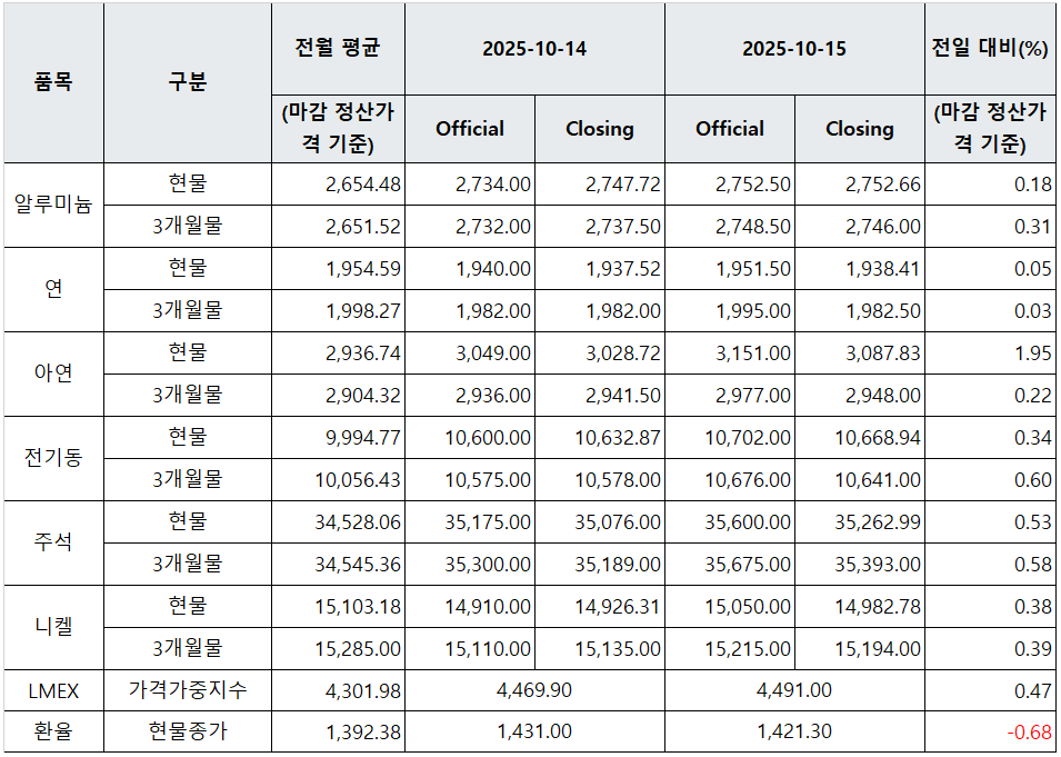 [표] LME 비철금속 및 환율 동향(10월 15일)