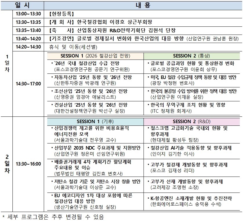이날 세션1은 ‘2026 철강산업 전망’을 주제로 포스코경영연구원 공문기 연구위원의 ‘`26년 국내 철강산업 수급 전망’을, 신한투자증권 박광래 연구원의 ‘자동차산업 `25년 동향 및 `26년 전망’을, 신영증권 엄경아 애널리스트가 ‘조선산업 `25년 동향 및 `26년 전망’을, 대한건설정책연구원 박선구 실장이 ‘건설산업 `25년 동향 및 `26년 전망’을 발표한다.