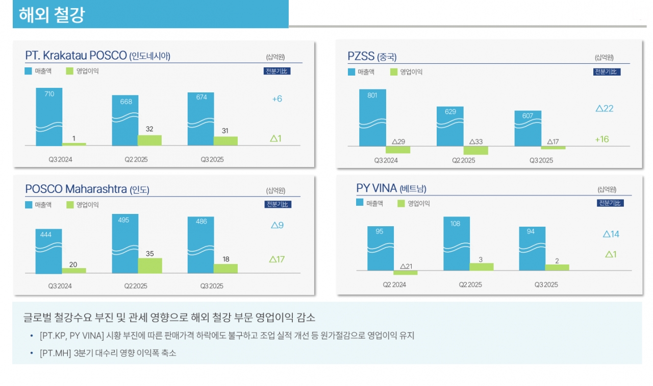 해외 철강 부문에선 글로벌 철강 수요 부진과 관세 영향으로 인해 전반적으로 영업이익이 감소하거나 유지되는 데 그쳤다. 인도네시아 PT.KP와 베트남 PY VINA 등은 현지 시황 부진에 따른 판매 가격 하락에도 불구하고 조업 실적 개선 및 원가 절감을 통해 영업이익(인니법인 310억 원/베트남법인 20억 원 수준)을 유지했다. 매각 협상이 이뤄지고 있는 중국 PZSS(장가항불수강/STS생산법인)은 직전 분기 대비 매출액 220억 원 감소했으나, 원가 절감 노력에 힘입어 영업이익은 전분기 대비 160억 원 증가했다. 미래 시장으로 꼽히는 인도에선 POSCO Maharashtra 법인이 3분기 중 발생한 대수리 영향으로 영업이익이 전분기 대비 170억 원 감소했다.