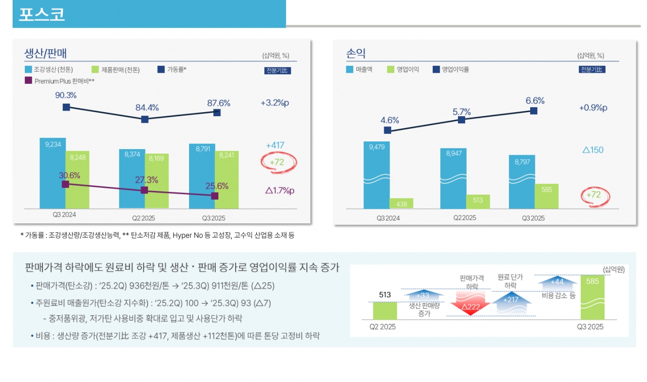27일, 포스코홀딩스가 3분기 실적 컨퍼런스콜을 개최했다. 포스코홀딩스는 기업실적 공개자료(IR)에서 철강 자회사 포스코가 2025년 3분기에 글로벌 철강 시황 부진 속에서도 국내 부문의 견조한 영업이익 증가를 기록했으나, 해외 부문은 일부 법인의 실적 악화로 수익성 유지에 어려움을 겪었다고 설명했다.