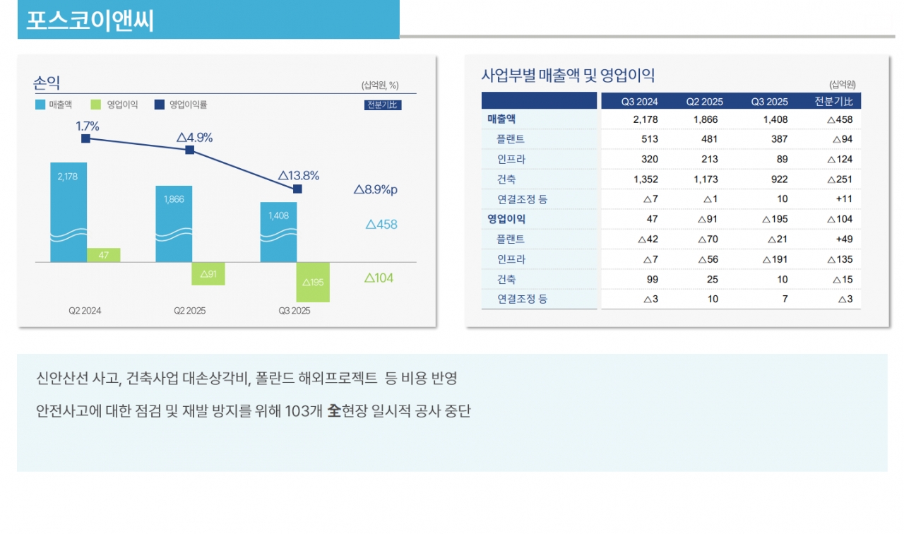 플랜트 및 대규모 인프라 시설, 민간 아파트 등을 건축하는 '포스코이앤씨'는 분기 매출액이 전분기 대비 4,580억 원 감소한 1조 4,080억 원을, 영업이익은 직전 분기 대비 1,040억 원 감소하여 1,950억 원의 적자를 기록했다. 이에 영업이익률이 마이너스 13.8%로 크게 악화됐다. 이는 신안산선 사업과 폴란드 해외 프로젝트 등에서 대규모 일회성 비용이 반영됐고 건축 사업 대손 상각비도 포함됐기 때문이다. 아울러 안전 사고에 대한 점검 및 재발 방지를 위해 103개 현장의 공사를 일시적으로 중단하면서 비용이 추가적으로 발생한 것으로 파악된다.
