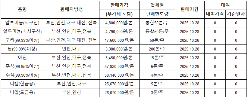 [표] 조달청 방출 가격(10월 28일)