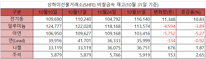 [표] 상하이거래소 재고(10월 31일)