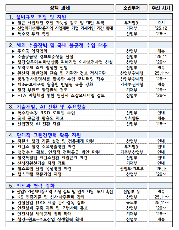 4일, 구윤철 경제부총리 겸 기획재정부 장관은 정부 서울청사에서 산업통상부, 중소벤처기업부, 공정거래위원회, 금융위원회, 금융감독원, 국무조정실 등이 참석한 가운데 철강업과 석유화학업, 중소기업 등을 고려한 산업경쟁력강화 관계장관회의를 개최했다. 이 회의에서 정부는 고율 관세 등으로 어려움을 겪고 있는 철강산업의 고도화를 지원하는 내용을 확정했다.
